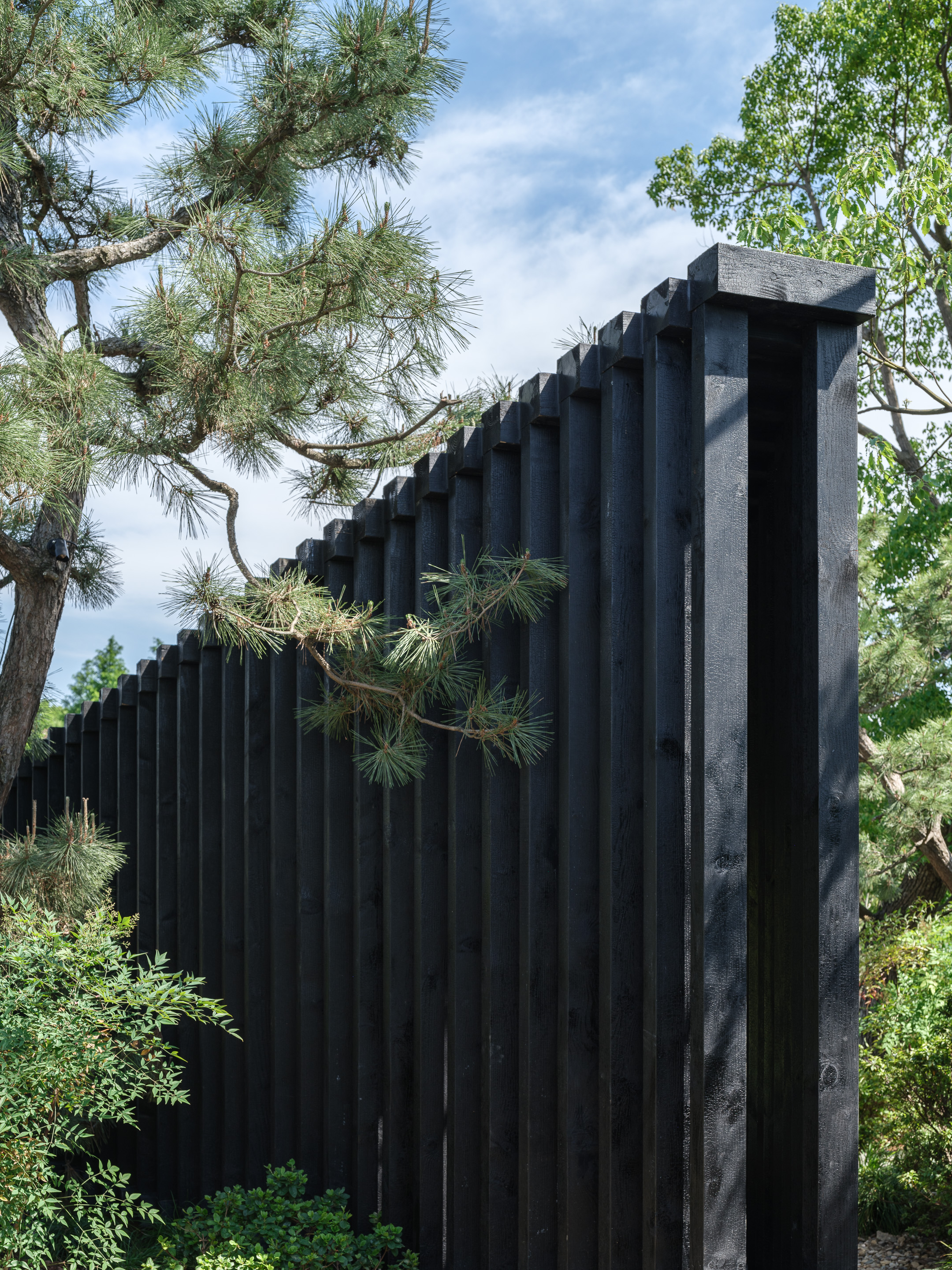 Charred wood (employing the yakisugi technique) is not only aesthetically striking but also preserves the wood by carbonizing its surface to be water-resistant. The process of charring evokes notions of purification and renewal through fire in various cultures and beliefs, as its dark, textured appearance cultivates a somber, introspective atmosphere. The charred wood allows the structure to integrate harmoniously with its natural context while maintaining a distinct architectural presence, reinforcing the pavilion's role as a mediator between the built and natural environments.